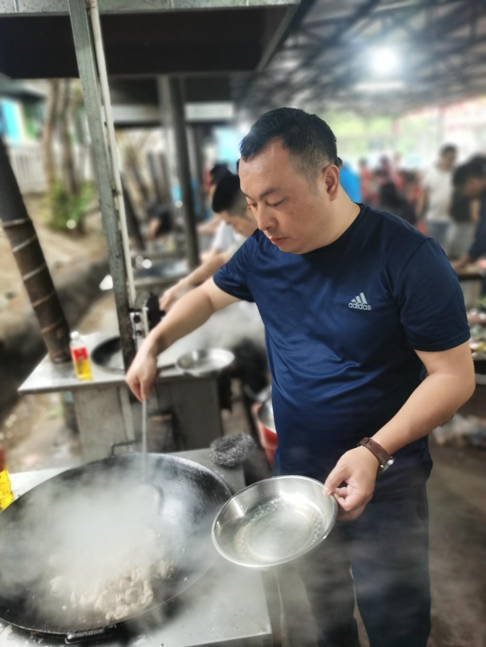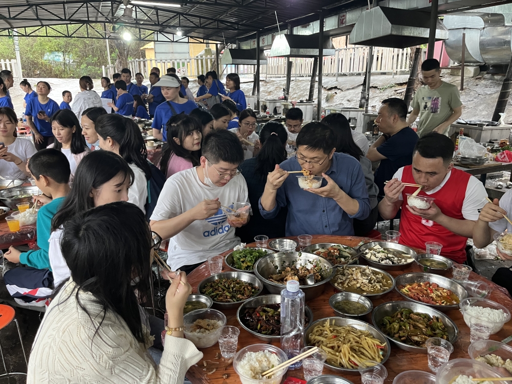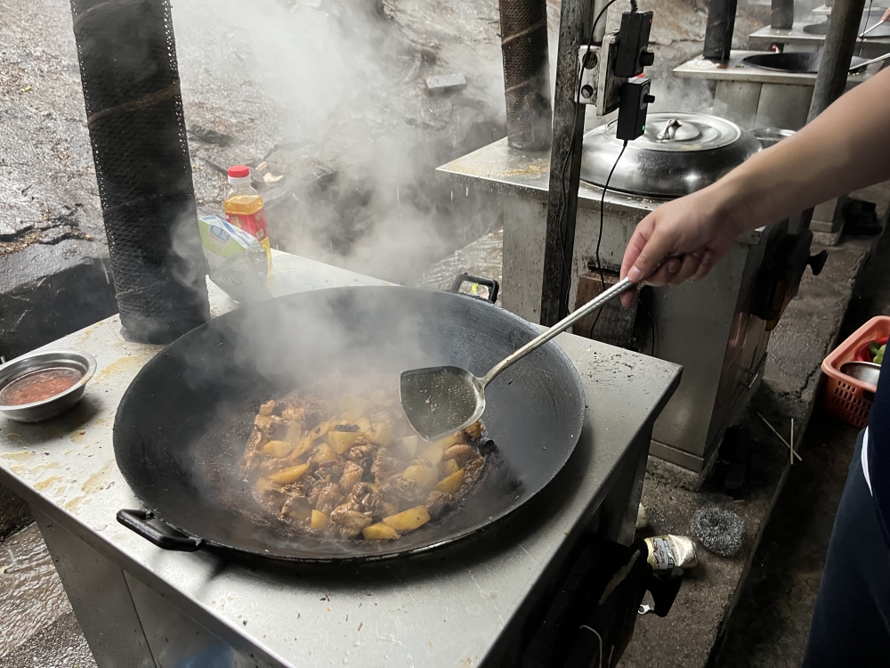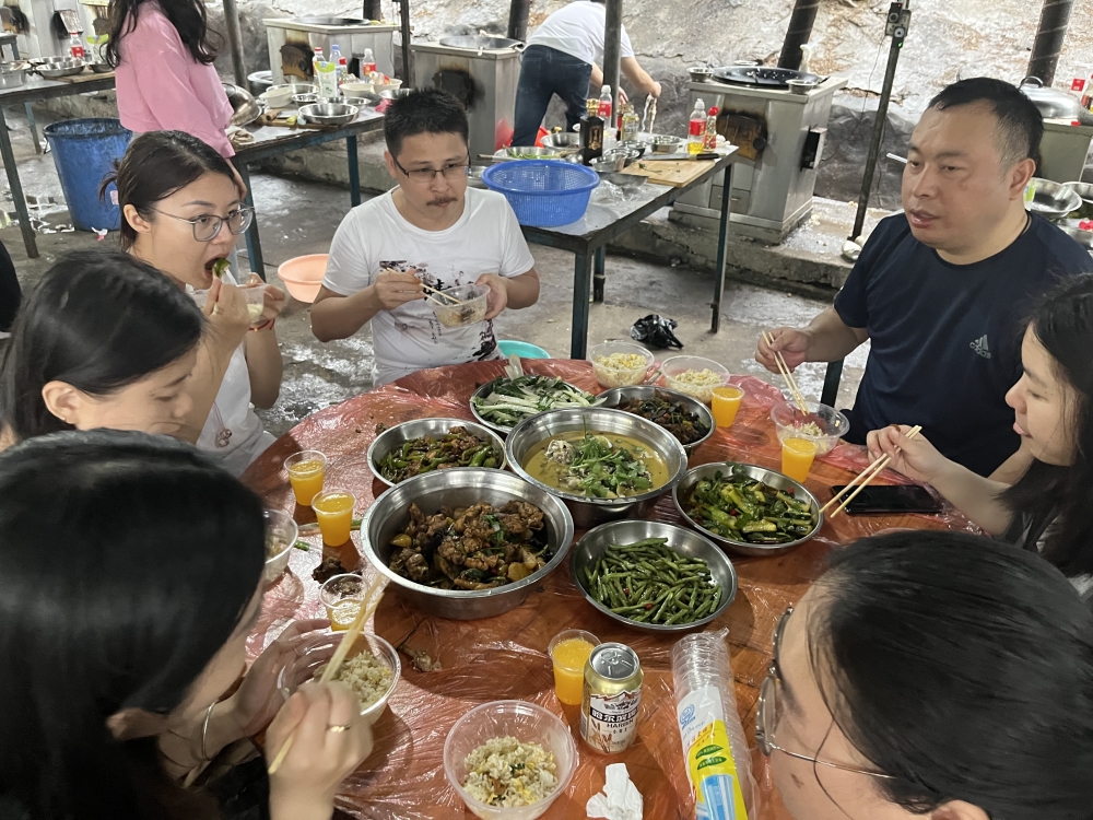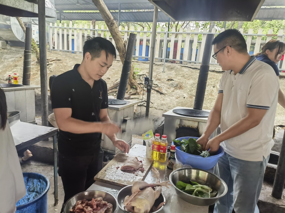 食材處理完之后,大廚們開始炒菜了,使用野外炭火炒菜,與大自然親密接觸,空氣中彌漫著飯菜的香味,這感覺能讓人忘卻一切煩惱